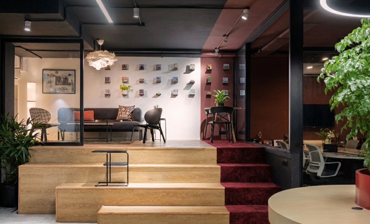 The studio offers a unique environment with flexible setups, stylish furniture props, and multiple shooting spaces including a conference room and amphitheatre-style area. It is perfect for corporate podcasts, interviews, brand videos, and professional content creation.