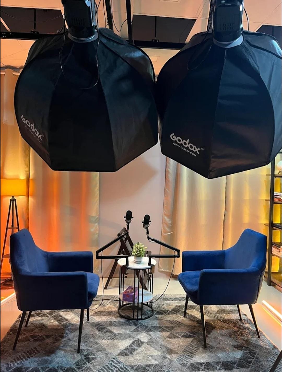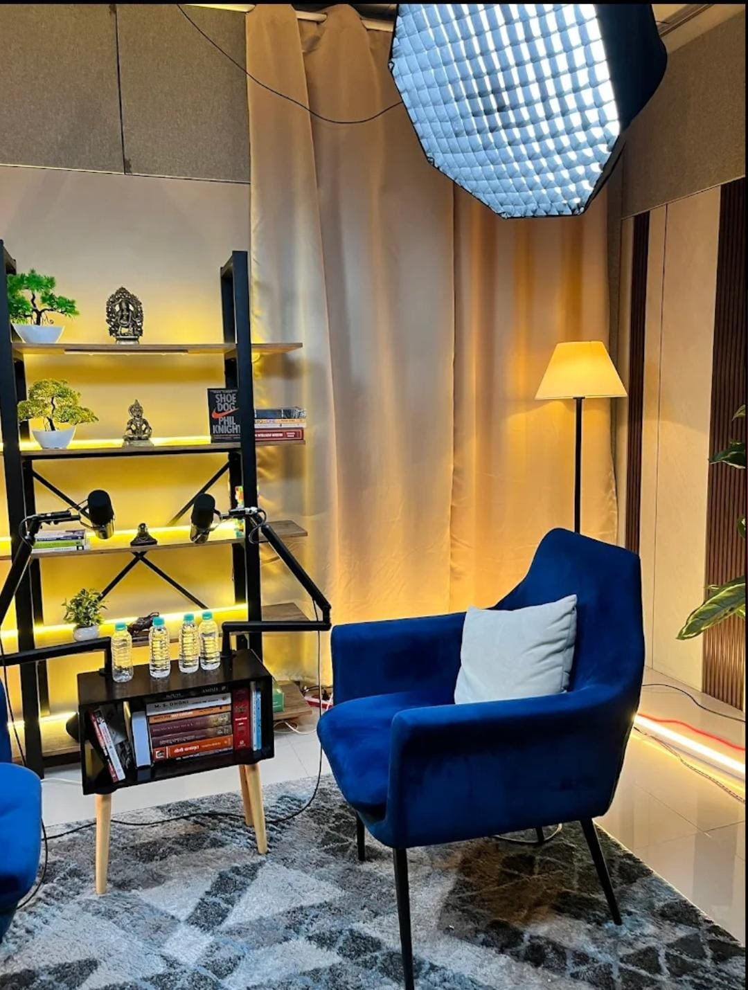 - Well-designed podcast recording space with a clean and modern look